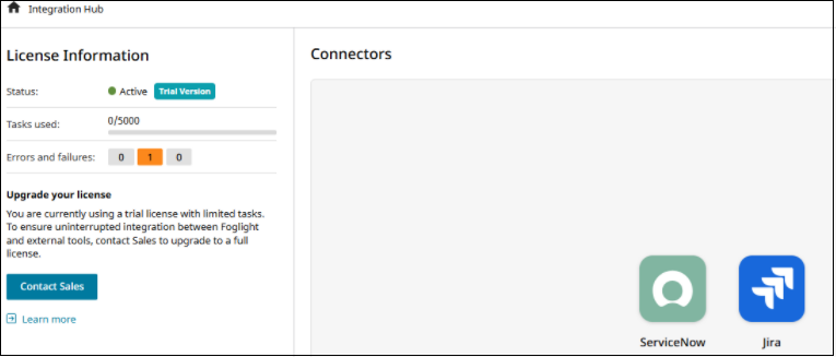The use of Integration Hub is optional and requires an additional license. For Foglight Cloud deployments, a Foglight owner can enable a trial license with 5,000 tasks to test this feature.