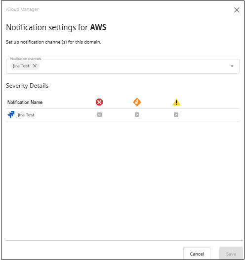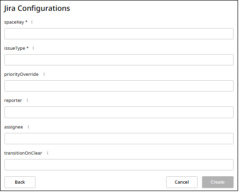 On the Settings screen, configure the specific parameters for ticket or issue creation in your external system. Each notification channel type (Jira or ServiceNow) provides specific configuration fields to enable effective integration with your external systems.