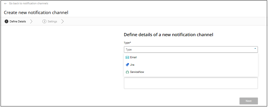 On the Define Details screen, click the Type dropdown and select your configured connector (ServiceNow or Jira). Also add the channel name.